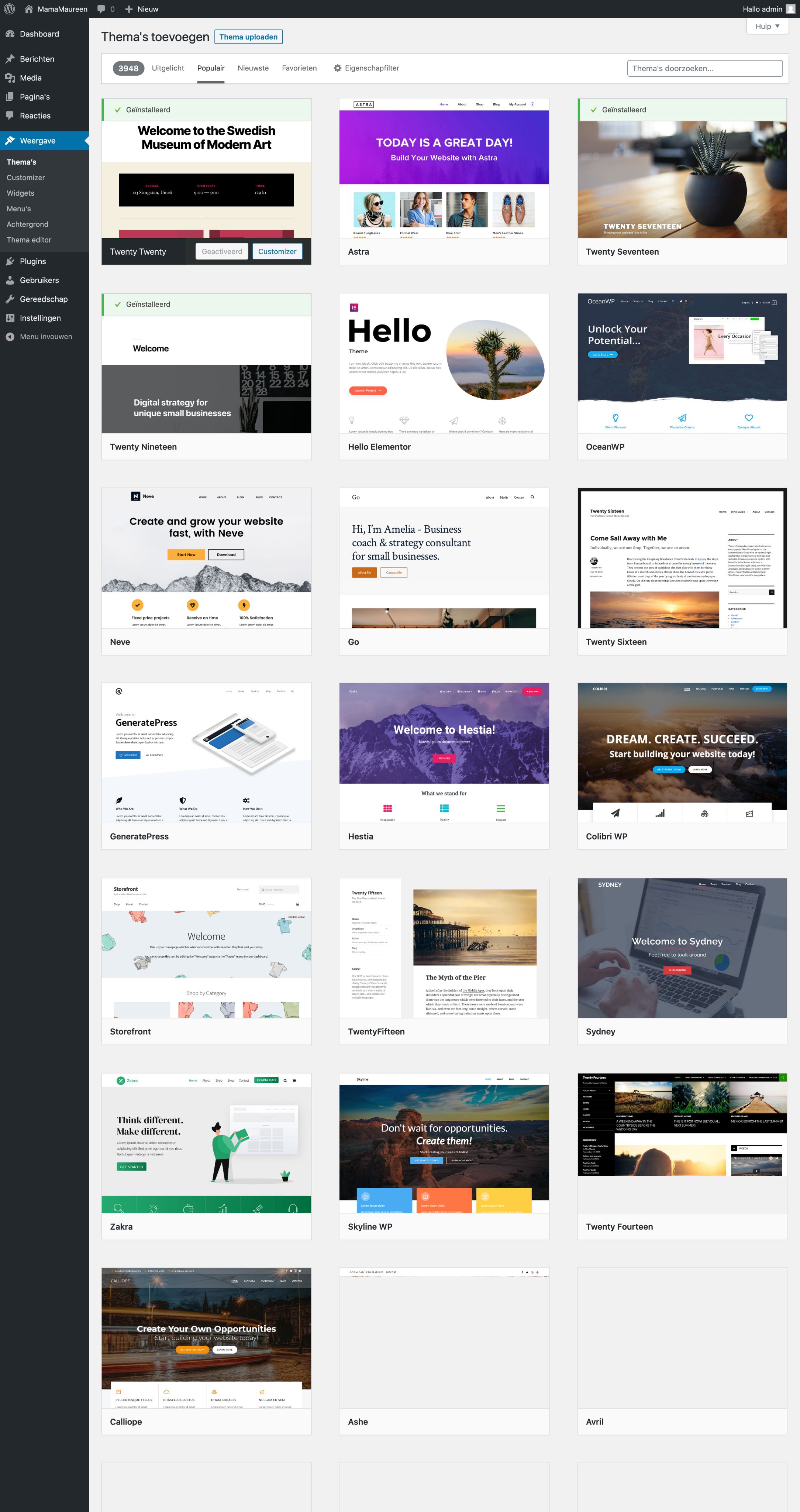 Nu je alles hebt geinstallerd wat je denkt nodig te hebben kunnen we aan de slag met je website aanpassen en mooi te maken. Eerst passen we het thema aan naar wat gewenst is en daarna passen we de paginas aan, dit kan de doen door een plugin te gebruiken zoals Elementor. Je zou hier ook wordpress zelf mee kunnen gebuiken alleen heb je dan niet zoveel mooie "componenten" als dat je zou hebben met een plugin.